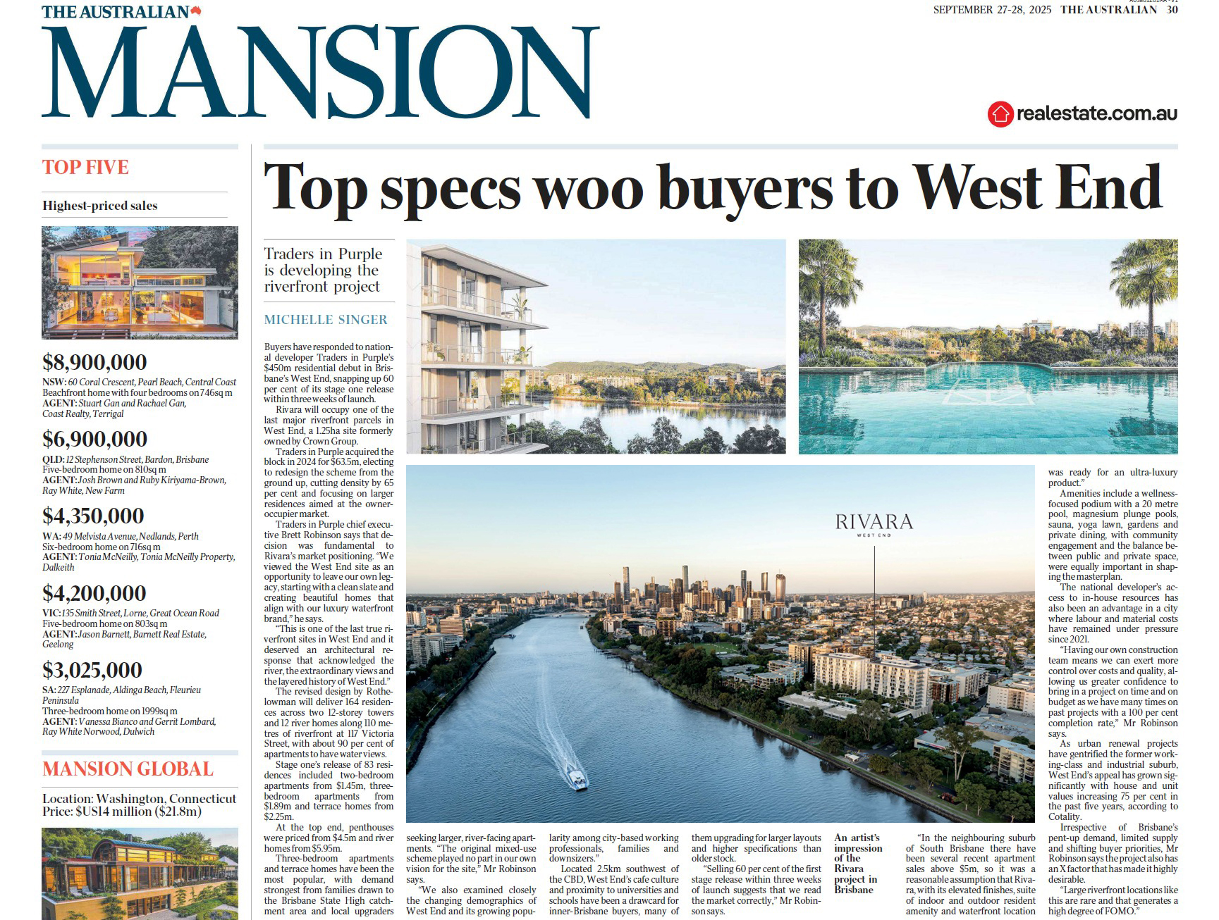 Traders in Purple has fast-tracked construction of its $500-million Rivara development in Brisbane’s West End after selling 75 per cent of its first release in just two months.