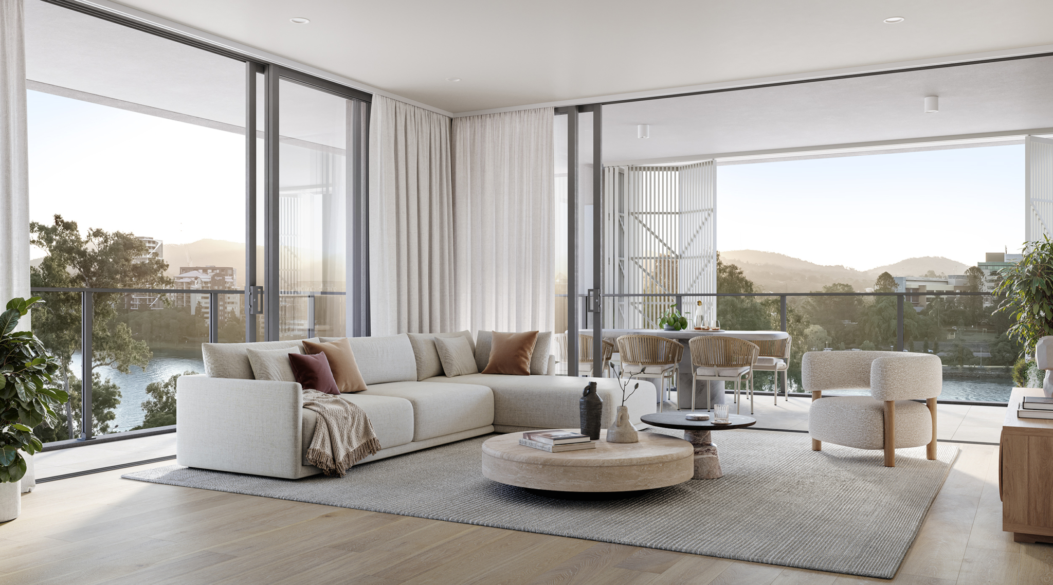 - Open-plan kitchen, dining and living framed by wraparound balcony capturing sweeping views and river breezes