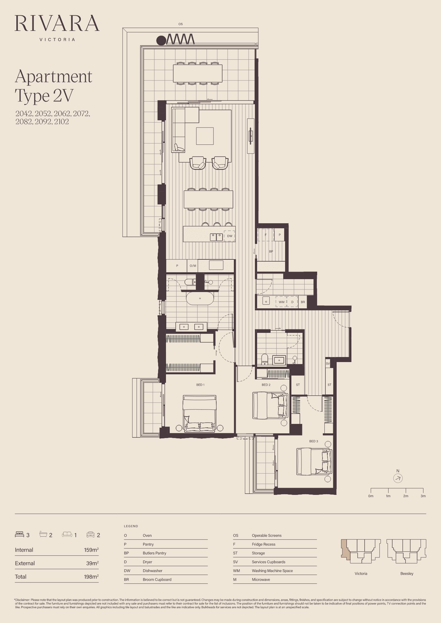 - 159m2 internal living space, plus 39m2 external, including private balconies from the master and secondary guest bedroom suite