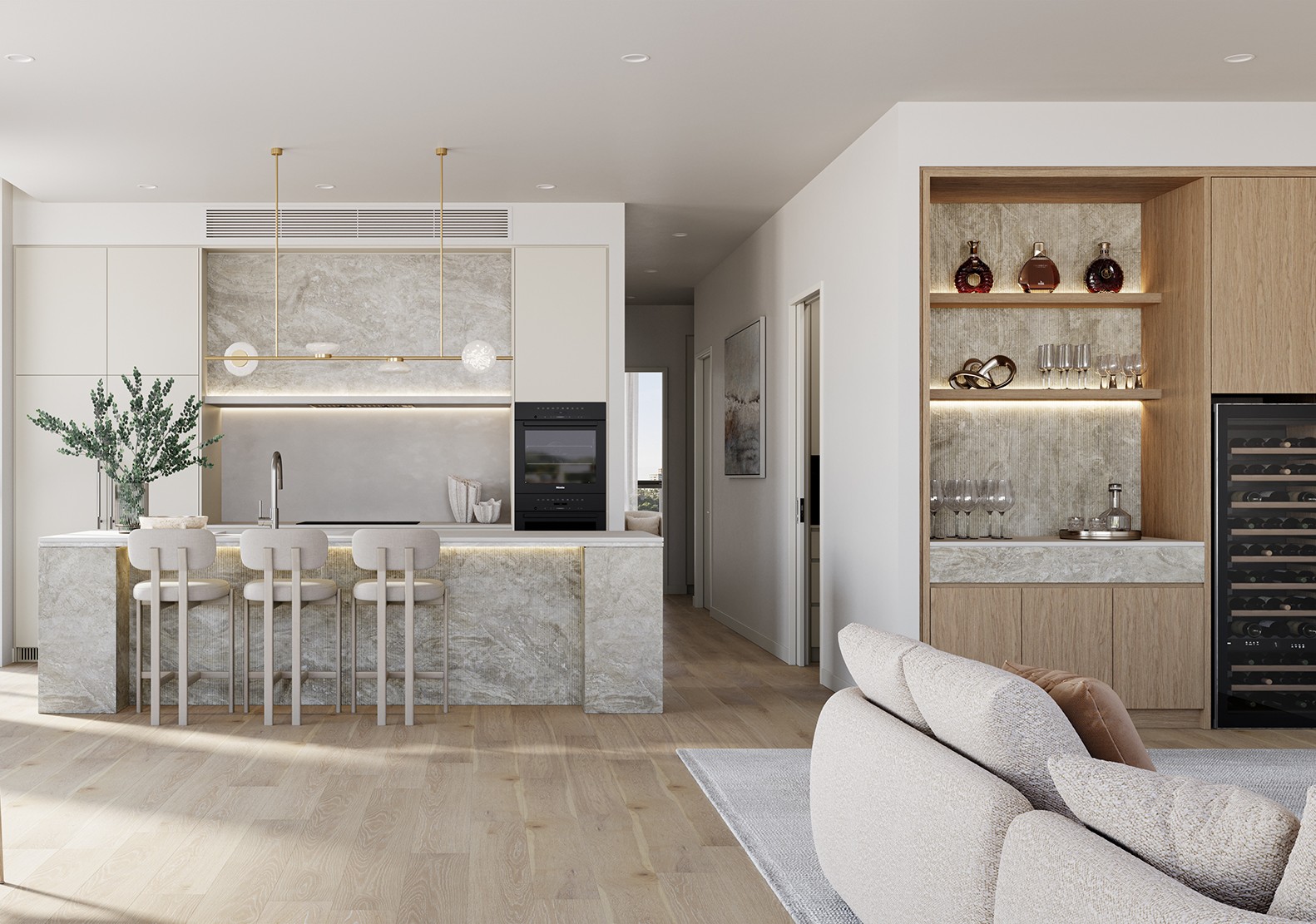- Refined interior palette of high-quality materials, including engineered timber flooring and stone detailing